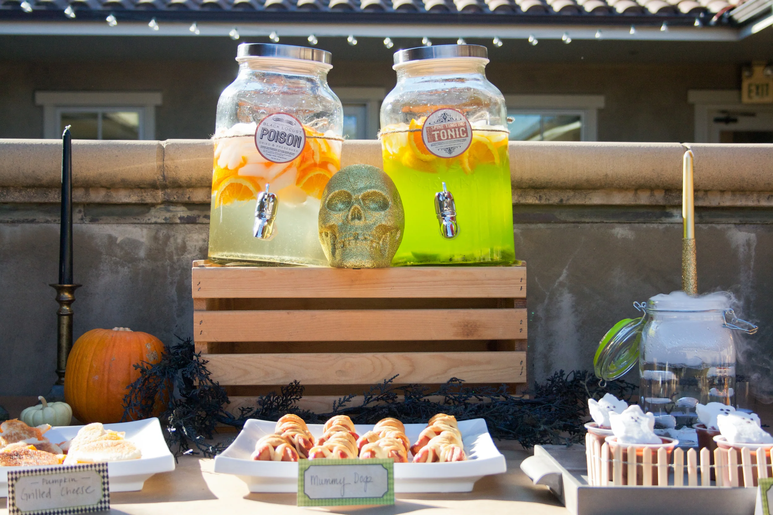 Glitter always seems to make its way into my design, so glitter-rimmed tea lights, gold glitter skulls, and glitter-dipped candles were all part of the spread. After finding a perfect pad of scrapbook paper, a “trick or treat” sign emerged, in addition to awesome drink and food signs. Oh, and of course some dry ice.