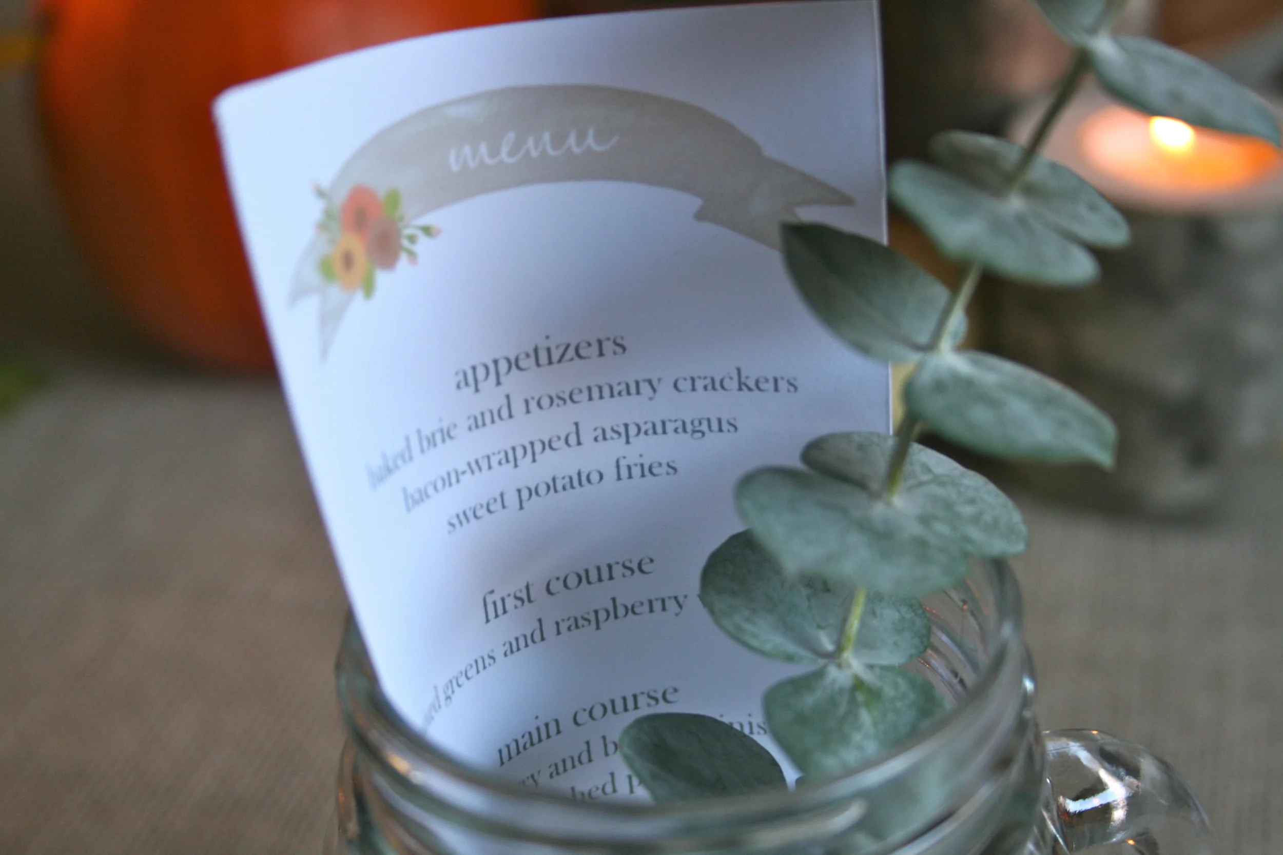 As for decorations, I made menus and place cards out of individual bread loaves for each seat. I DIY-ed a wood slab chalkboard, made some flower arrangements in birch vases, and my favorite - a grapevine chandelier with baby's breath.
